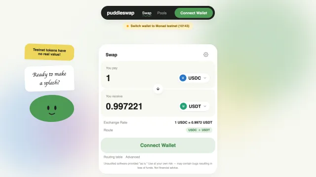DeFiDecentralized exchange on Monad testnet. Swap tokens, provide liquidity, and explore DeFi on Monad.
